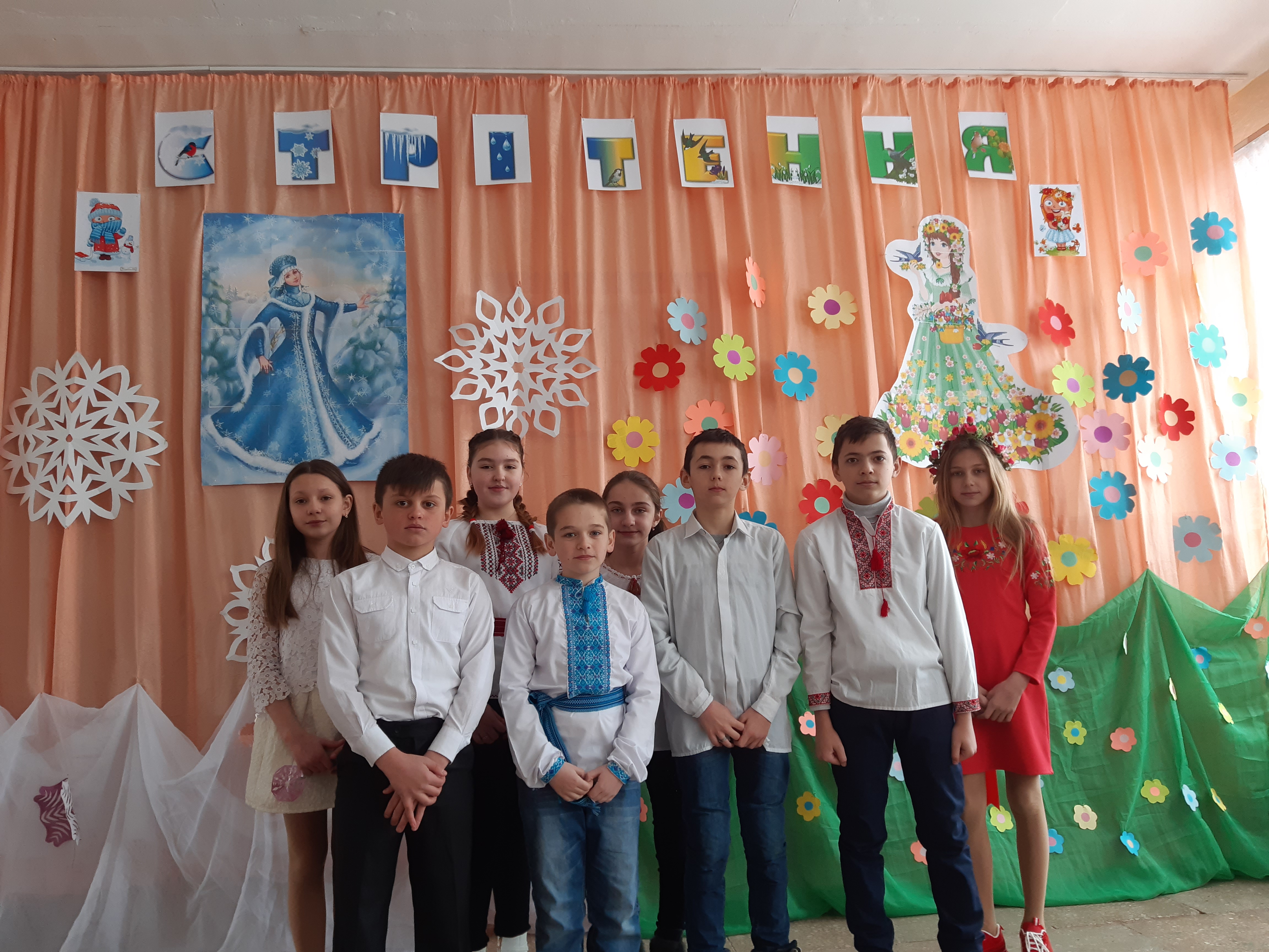 У житті немає випадкових зустрічей. Бог створив світ. Він розділив світло і темряву. А коли вони зустрічаються, то настає або день, або ніч. У природі іде постійна боротьба між холодом і теплом, і якщо перемагає тепло, то настає весна або літо. А коли настає останній місяць зими то ми всі чекаємо на прихід весни. У народі кажуть: „ Як лютий не лютуй, а на весну брів не хмур”. А з приходом лютого до нас приходить і останнє зимове свято Стрітення. Стрітення - свято християнське і народне, дві зустрічі, дві філософії, дві мудрості. Учні 6 класу (кл. керівник Далекорей В.І.) підготували виступ.